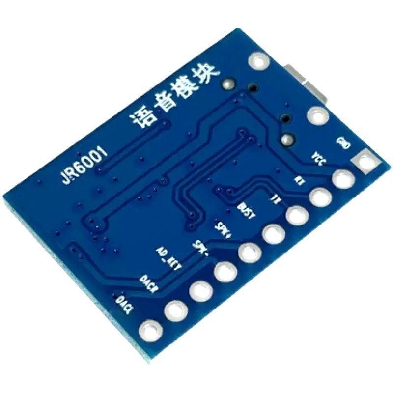 Модуль автономного аудиоплеера на чипе JR6500 со встроенной памятью 4МБ и усилителем, мощностью 3Вт. Сортировка файлов во Flash памяти осуществляется по имени файла, которое должно состоять из шести цифр, например: 00001.mp3. Управление модулем осуществляется с помощью резистивной клавиатуры, подключенной к пину AD-KEY, или с помощью микроконтроллера через интерфейс UART. Модуль позволяет подключить внешний динамик или может быть подключен к внешнему усилителю. Распиновка модуля указана на обратной стороне платы.
