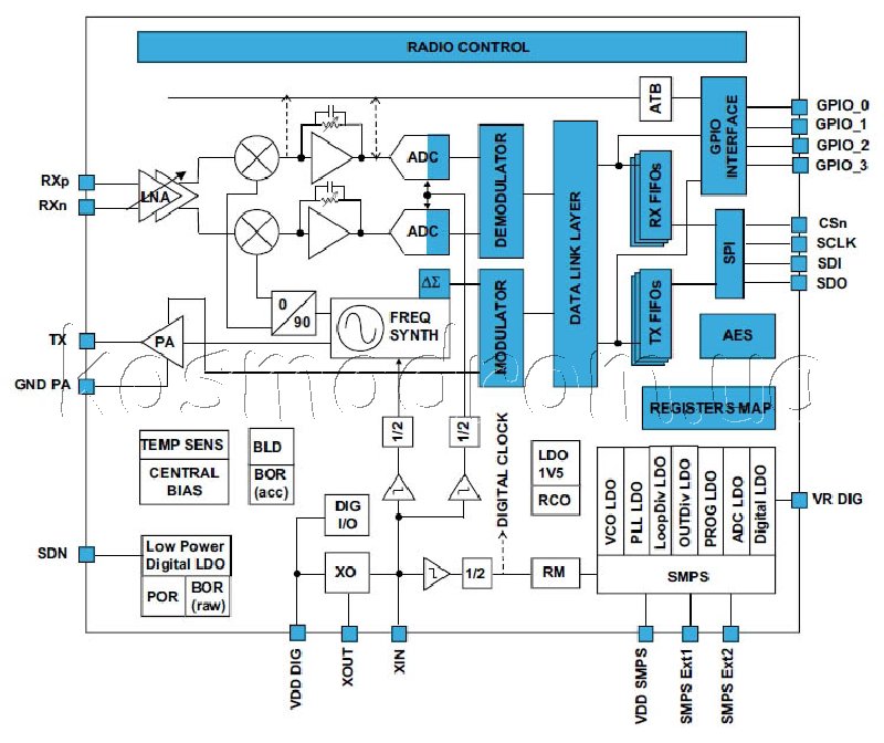 - Схемы модуляции: 2-FSK, GFSK, MSK, GMSK, OOK, ASK
