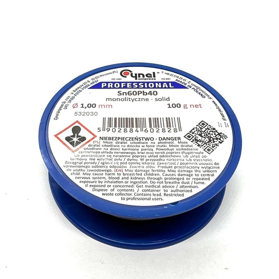 Проволочный припой Sn-60% Pb-40% 1,00мм 0,05кг Cynel. Тип флюса - галогеновый, с канифолью, F-SW26, Содержание флюса - 2.5%.