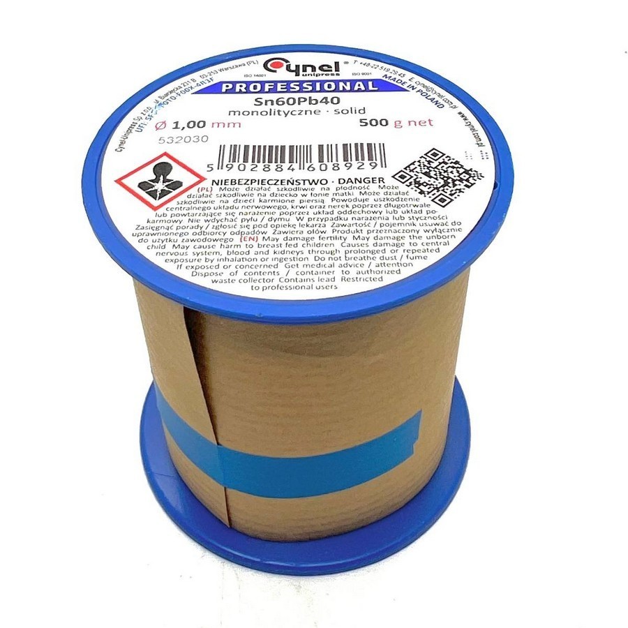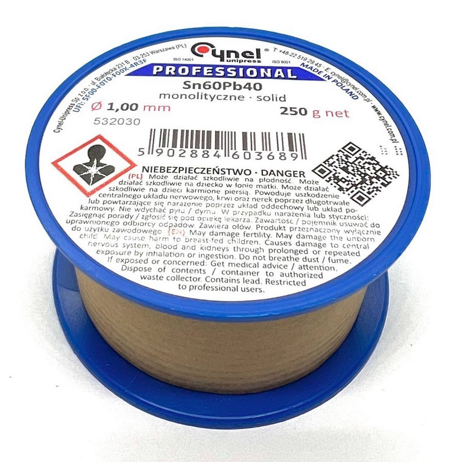 Проволочный припой Sn-60% Pb-40% 1,00мм 0,25кг Cynel. Тип флюса - галогеновый, с канифолью, F-SW26, Содержание флюса - 2.5%.