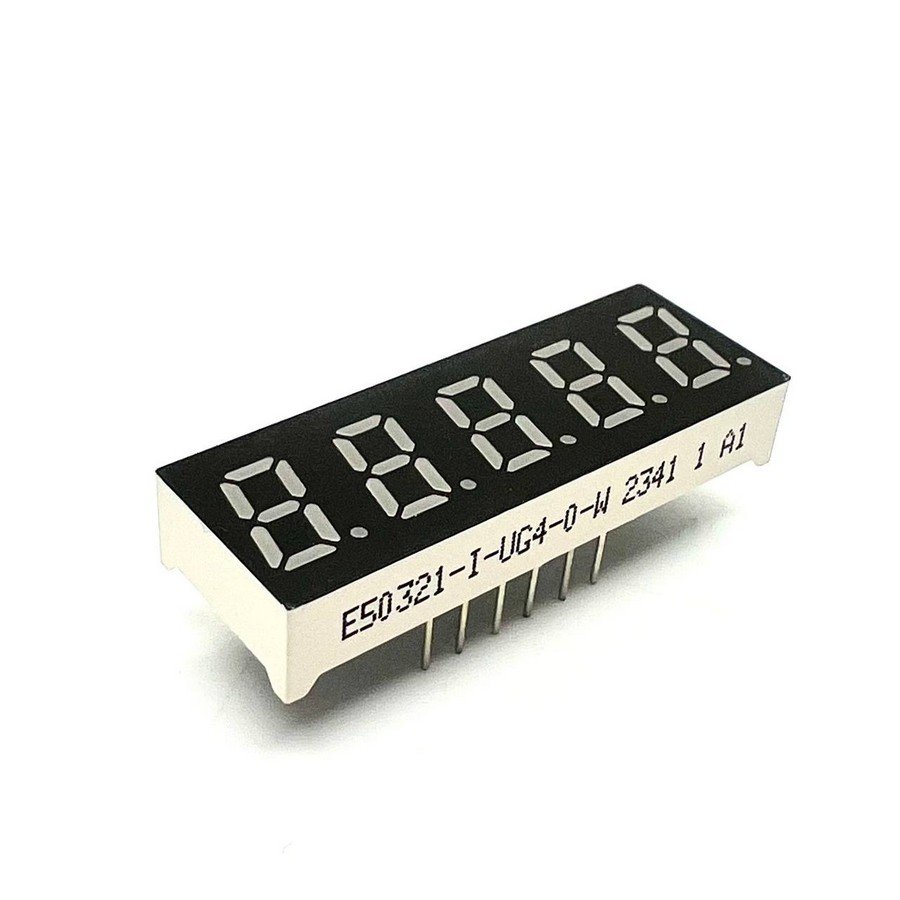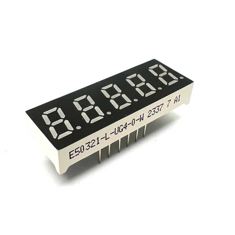 | E50321-L-UG4-0-W Светодиодный индикатор пятисимвольный Светодиодный индикатор, общий КАТОД, высота символа 8,13 мм, пяти-символьный, цвет свечения ЗЕЛЕНЫЙ. фон черный. Динамическая индикация