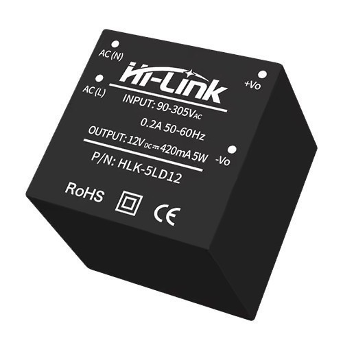 | HLK-5LD12 Модульный сетевой источник питания на плату AC/DC преобразователь на плату в пластиковом корпусе. Мощность: 5 Вт. Входное напряжение: 85...305В Выходное напряжение: 12В, Вых. ток: 420мA ном, Кол-во выходов: 1