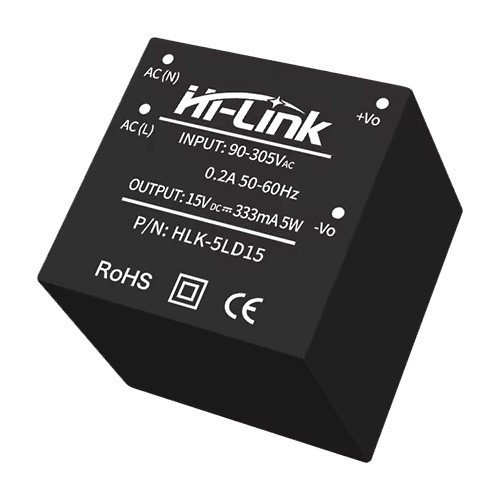 | HLK-5LD15 Модульный сетевой источник питания на плату AC/DC преобразователь на плату в пластиковом корпусе. Мощность: 5 Вт. Входное напряжение: 85...305В Выходное напряжение: 15В, Вых. ток: 333мA ном, Кол-во выходов: 1