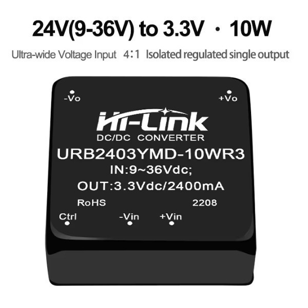 DC/DC преобразователь на плату в пластиковом корпусе. Мощность: 10 Вт. Входное напряжение: 24 VDC (9...36 VDC). Выходное напряжение: 3,3 VDC. Вых. ток: 2400 мА. Кол-во выходов: 1
