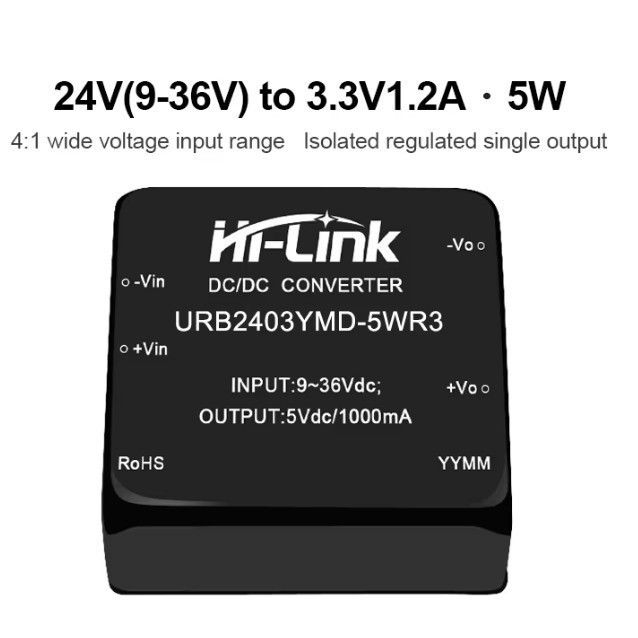 DC/DC преобразователь на плату в пластиковом корпусе. Мощность: 5 Вт. Входное напряжение: 24 VDC (9...36 VDC). Выходное напряжение: 3,3 VDC. Вых. ток: 1200 мА. Кол-во выходов: 1