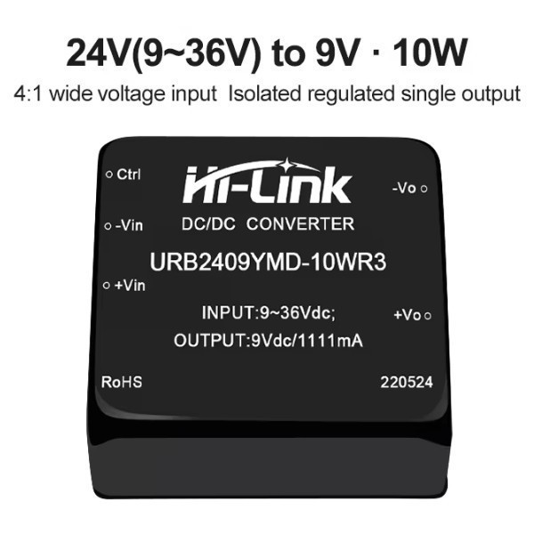 DC/DC преобразователь на плату в пластиковом корпусе. Мощность: 10 Вт. Входное напряжение: 24 VDC (9...36 VDC). Выходное напряжение: 9 VDC. Вых. ток: 1111 мА. Кол-во выходов: 1